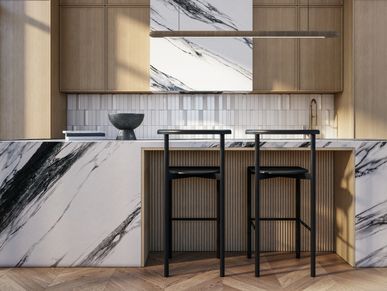 Marble is a natural stone with distinctive veining and patterns, renowned for its elegance and beauty. While softer than some other stones, it’s commonly used for countertops, flooring, and accents in a range of colors and finishes. Careful maintenance is required to preserve its appearance.